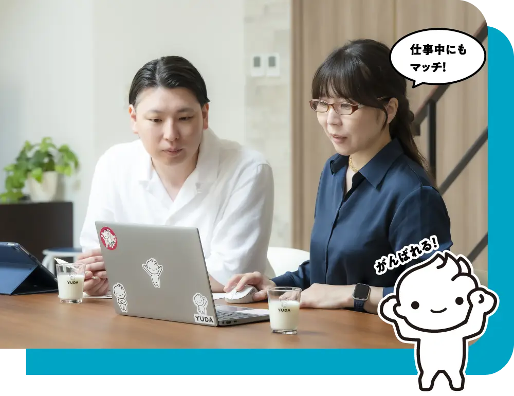 YUDAミルク社員もオフィスでゴクゴク。500mlパックにストローをさして仕事のおともにしたり、打ち合わせのテーブルにも。スッキリとした甘さで、気軽に心をリフレッシュできます。