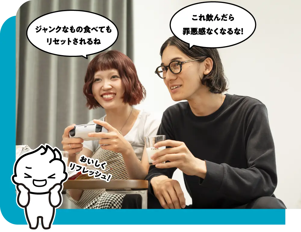 ふたりのまったり時間にも、のむ湯田ヨーグルトがぴったり。スナック菓子だけでは不足しがちな栄養と水分を同時にチャージ。乳酸菌やタンパク質で体をいたわりながら、程よい酸味が心もリフレッシュしてくれます。