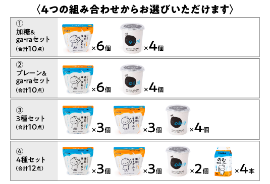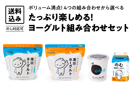 プレミアム湯田ヨーグルト、ga・raギリシャヨーグルト、10月1日発売の「のむ湯田ヨーグルト」の組み合わせが選べるセットの登場です。4つの組み合わせから選べておトクな送料込みセットでの販売となります!